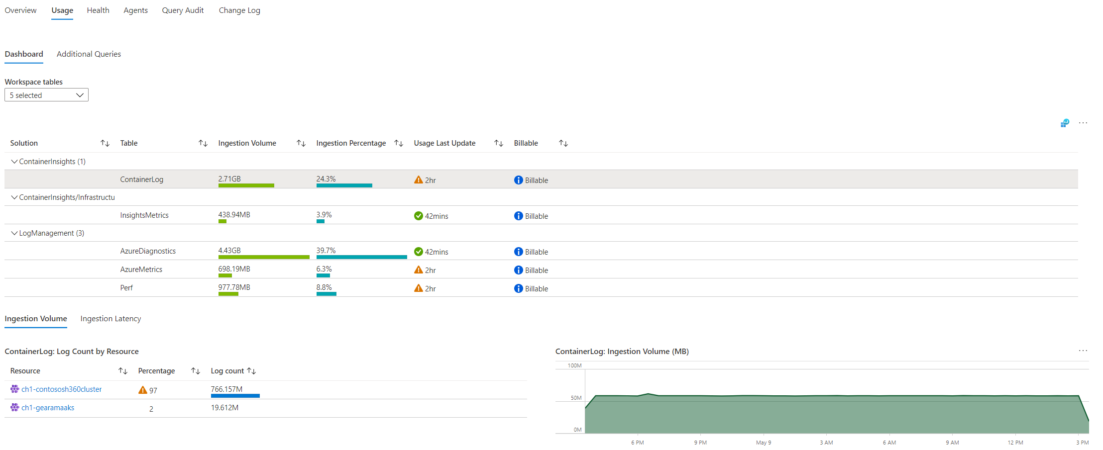 此选项卡提供有关工作区使用情况的信息。 仪表板子选项卡显示表中显示的引入数据。 它默认显示所选时间范围内使用最多的五个表。 这些相同的表显示在“概述”页上。 使用“工作区表”下拉列表选择要显示的表。