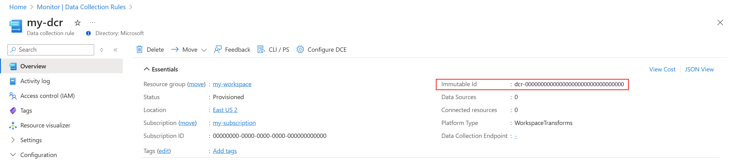 在创建 DCR 时会生成 DCR Immutable ID。 可以从 Azure 门户中 DCR 的 Overview 页面检索它。