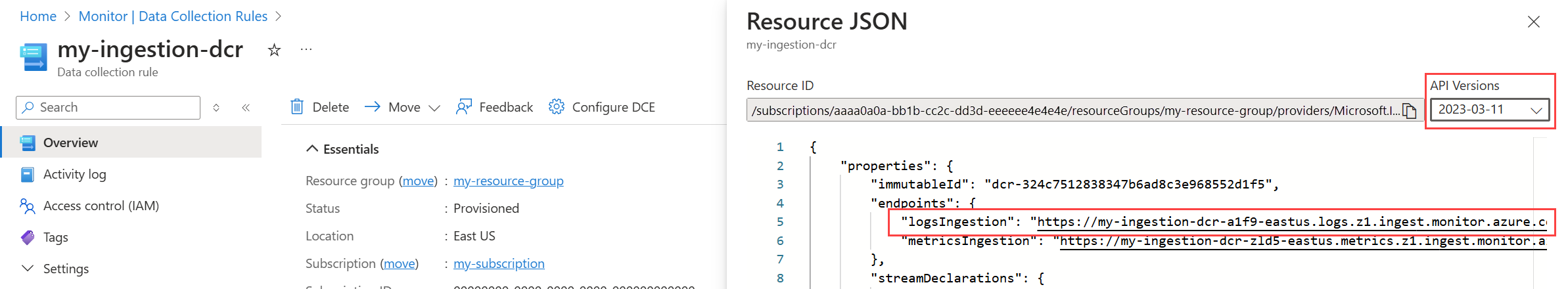 创建用于直接引入的 DCR 时,会生成 DCR 日志引入终结点。 若要检索此终结点,请在Azure门户中的 JSON 视图中打开 DCR。 可能需要将 API 版本更改为要显示的终结点的最新版本。