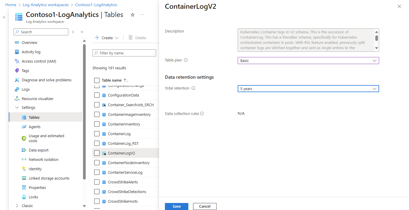 Update-AzOperationalInsightsTable -ResourceGroupName ContosoRG -WorkspaceName ContosoWorkspace -TableName ContainerLogV2 -Plan Basic