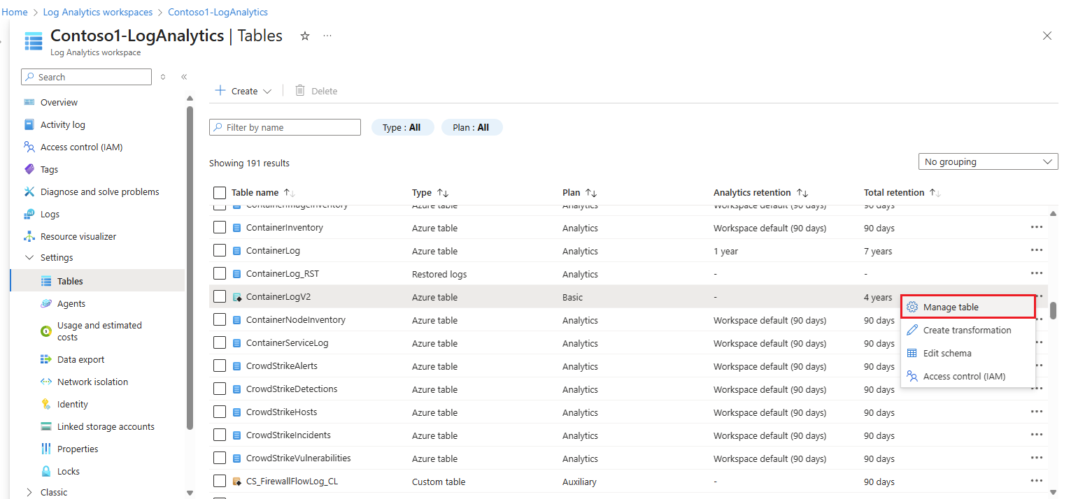 az monitor log-analytics workspace table update --subscription ContosoSID --resource-group ContosoRG --workspace-name ContosoWorkspace --name ContainerLogV2 --plan Basic