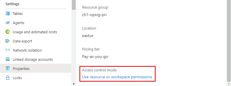 在工作区“概述”页上的“Log Analytics 工作区”菜单中查看当前的工作区访问控制模式。