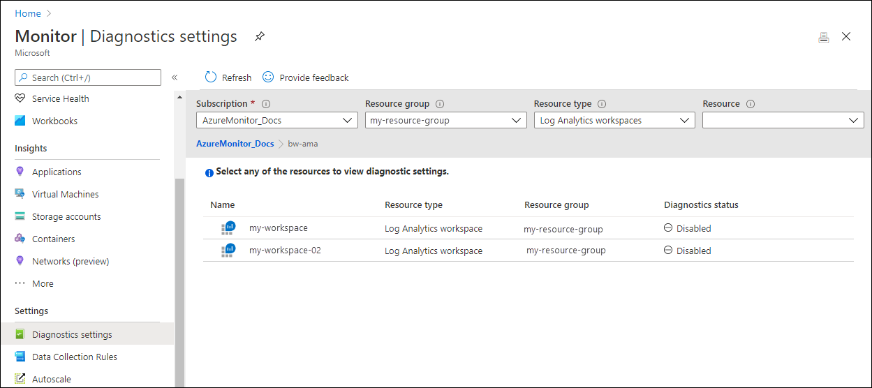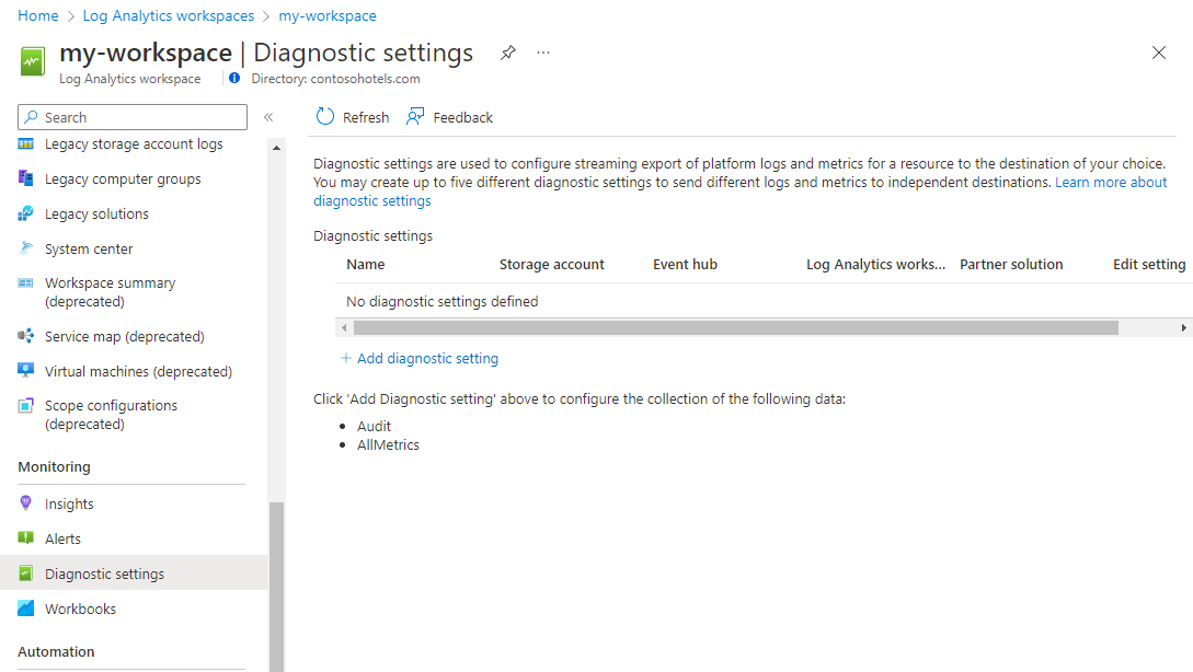 在以下任一位置访问 Azure 门户中 Log Analytics 工作区的诊断设置:
