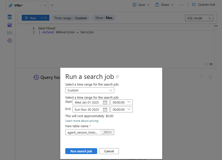搜索作业会扫描数据并将其结果发送到与源数据相同的工作区中的新表。 搜索作业开始后,结果表即告可用,但结果可能需要一段时间才能开始显示。 根据扫描数据的 定价模型 和引入结果的大小产生成本。 在运行搜索作业之前,可以使用成本估算来确定是否运行作业。