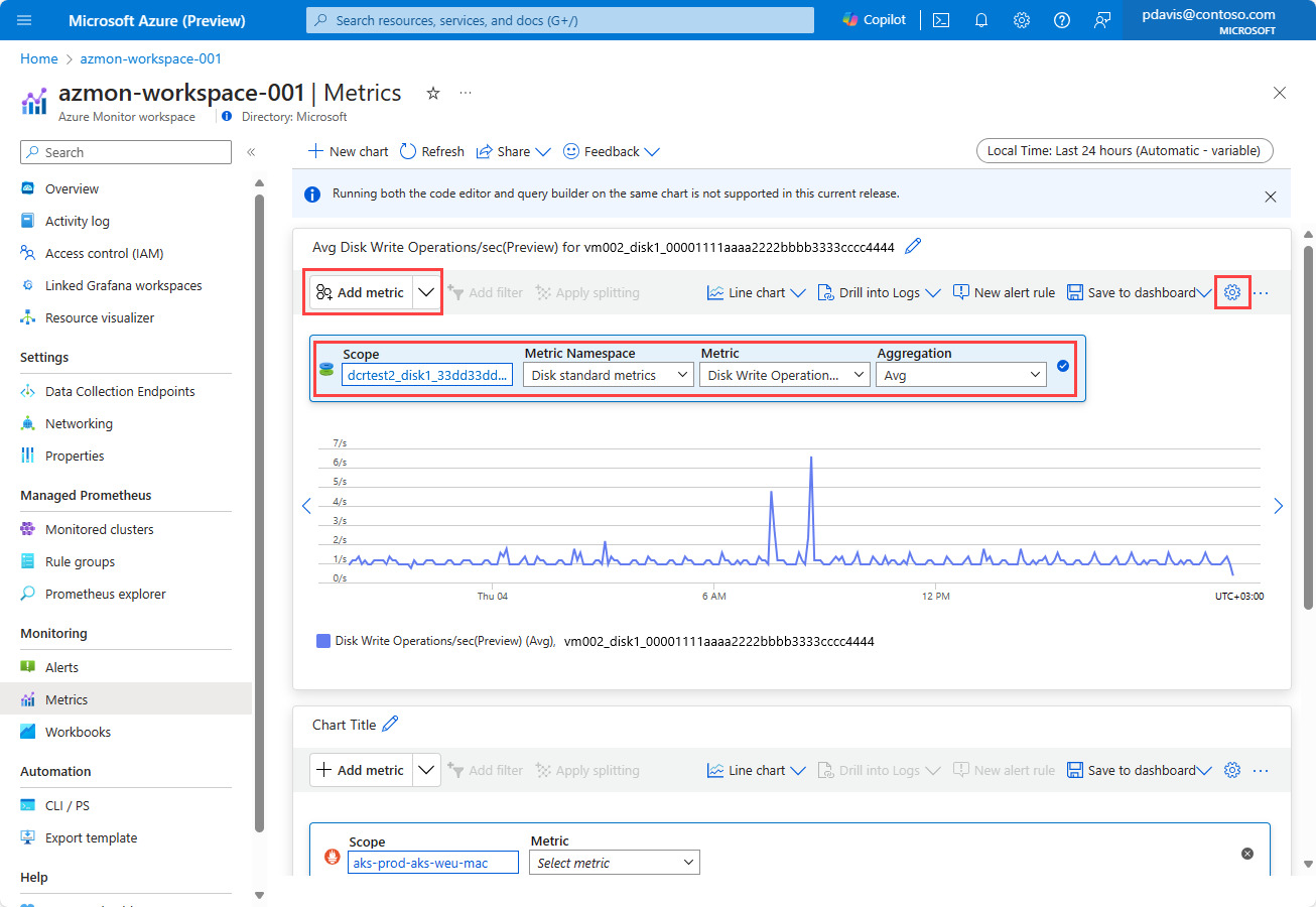 使用生成器添加图表后,可以从任何 Azure 资源中选择指标。 生成器提供所选作用域中可用的指标列表。 从生成器中选择指标、聚合类型和图表类型。 生成器不能用于绘制存储在 Azure Monitor 工作区中的指标的图表。