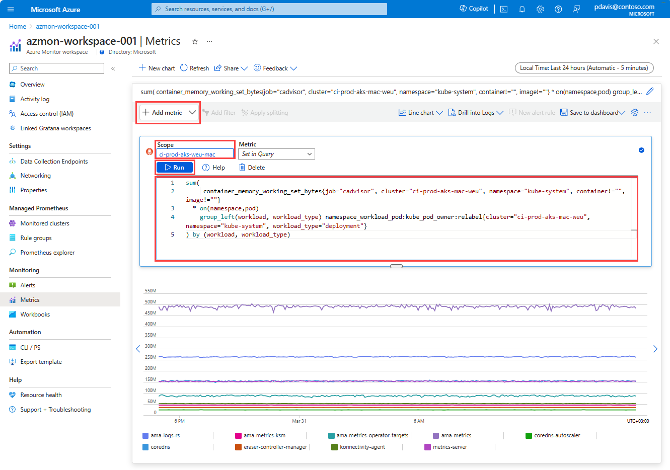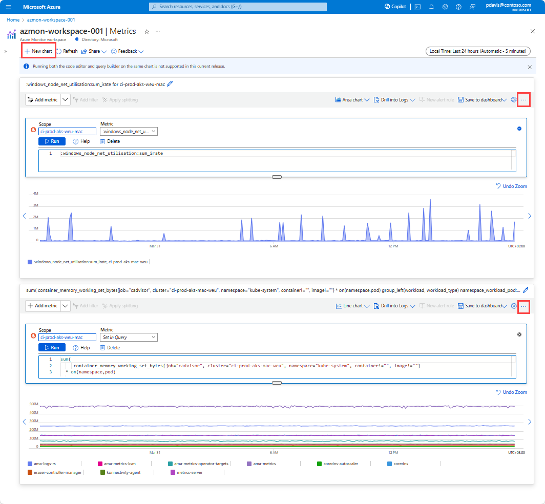 使用编辑器添加图表可以输入 PromQL 查询来检索指标数据。 编辑器为 PromQL 查询提供语法突出显示和 Intellisense。 目前,查询仅限于存储在 Azure Monitor 工作区中的指标。 有关 PromQL 的详细信息,请参阅 查询 Prometheus。