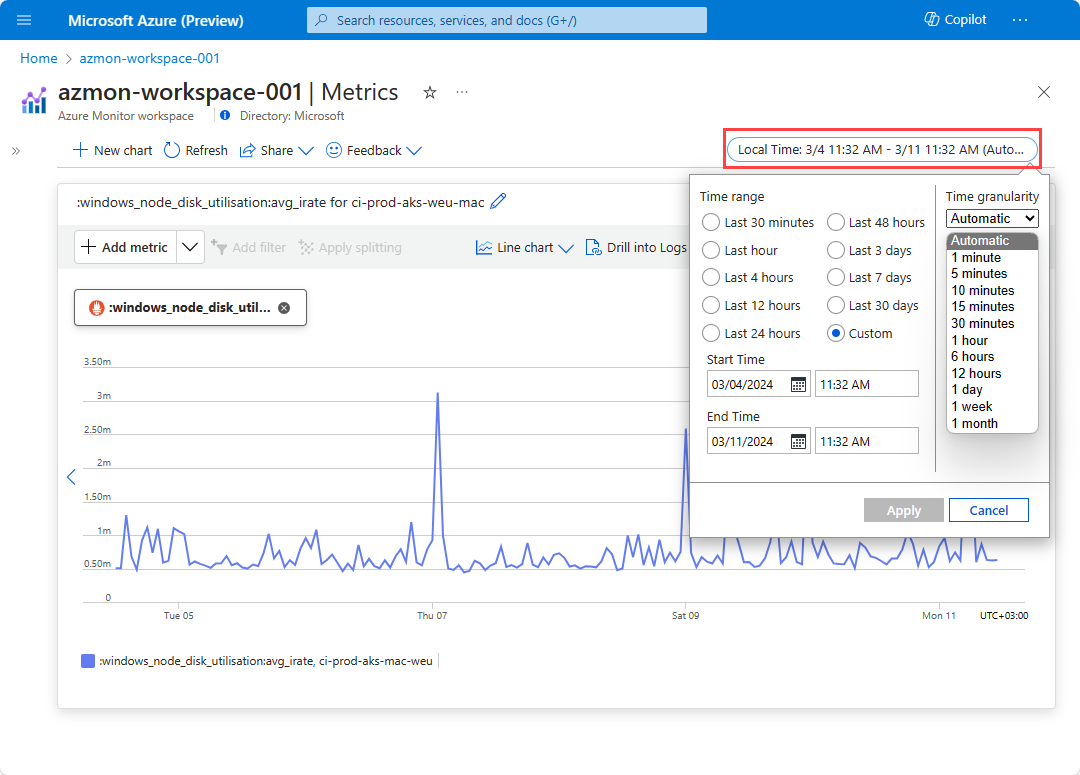 配置指标图表的时间范围和粒度,以查看与监视方案相关的数据。 默认情况下,图表显示最近 24 小时内的指标数据。