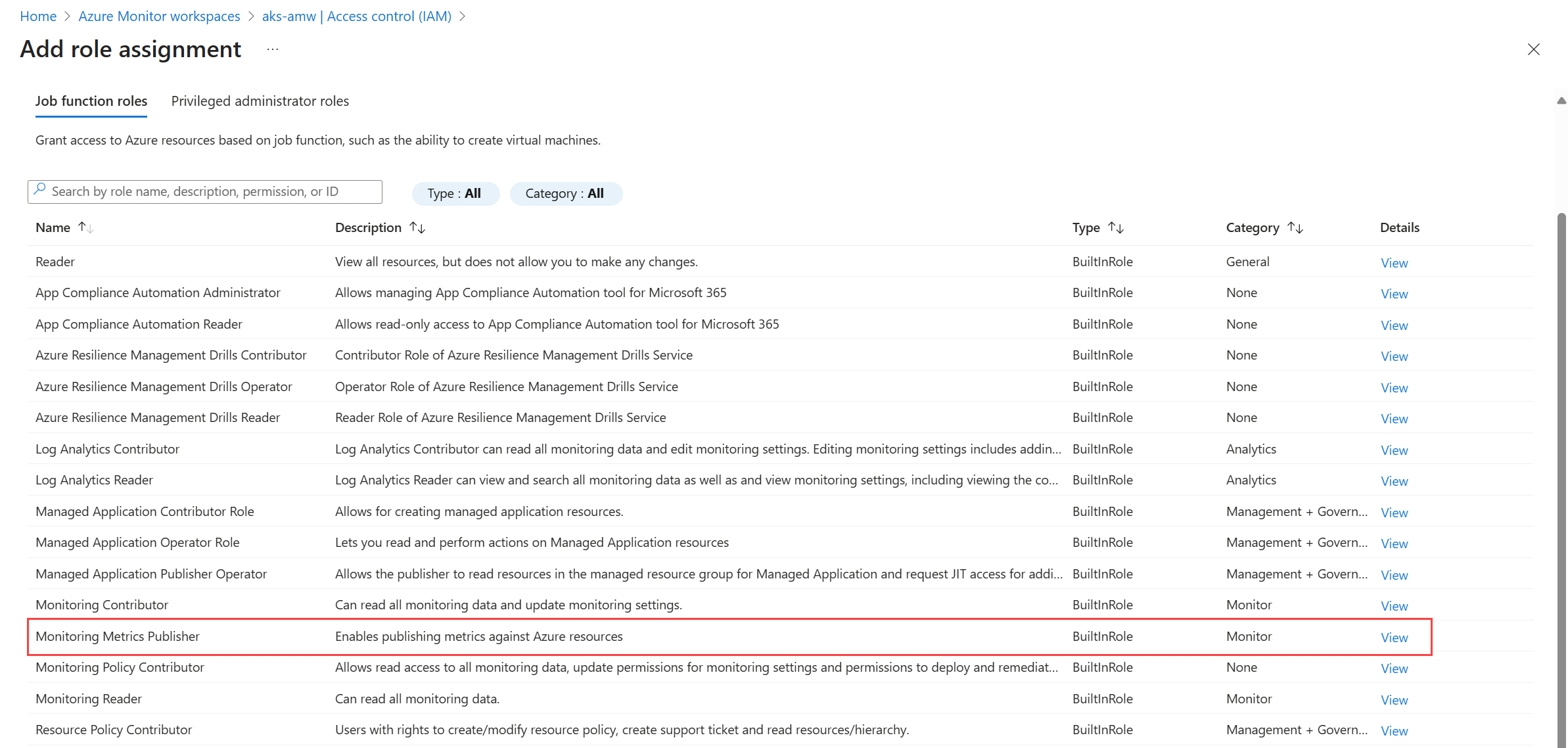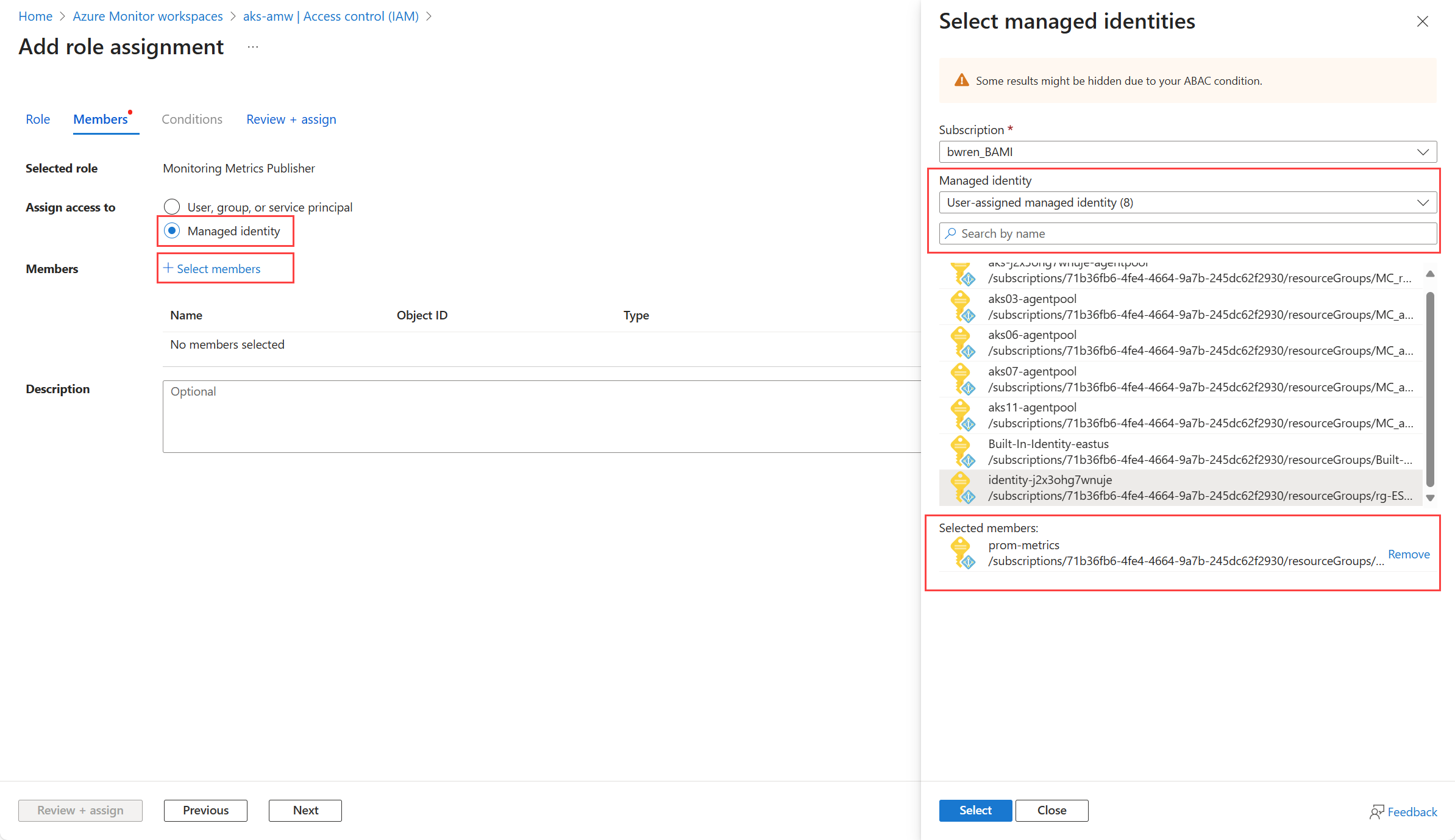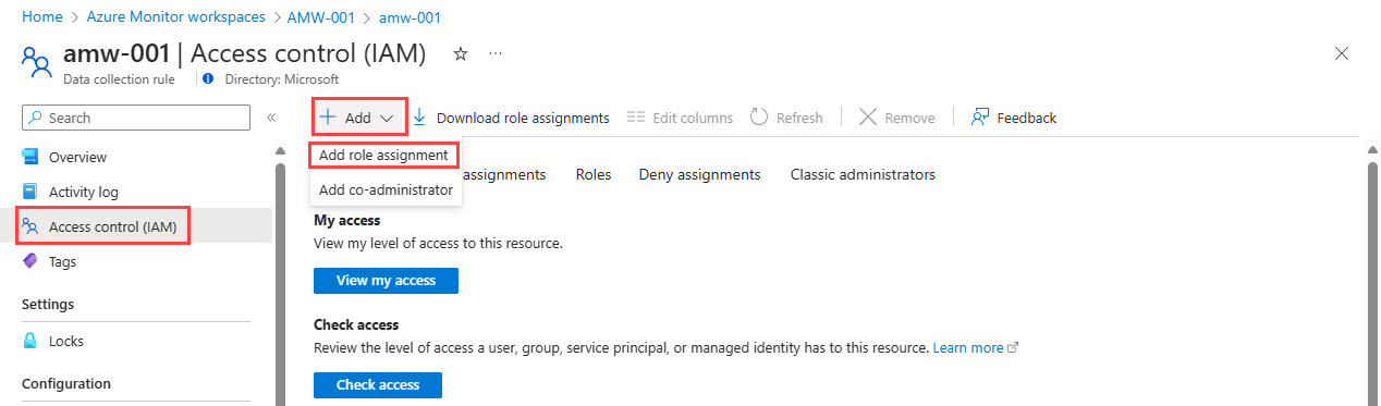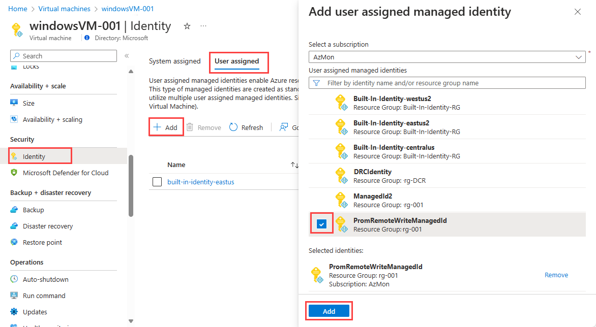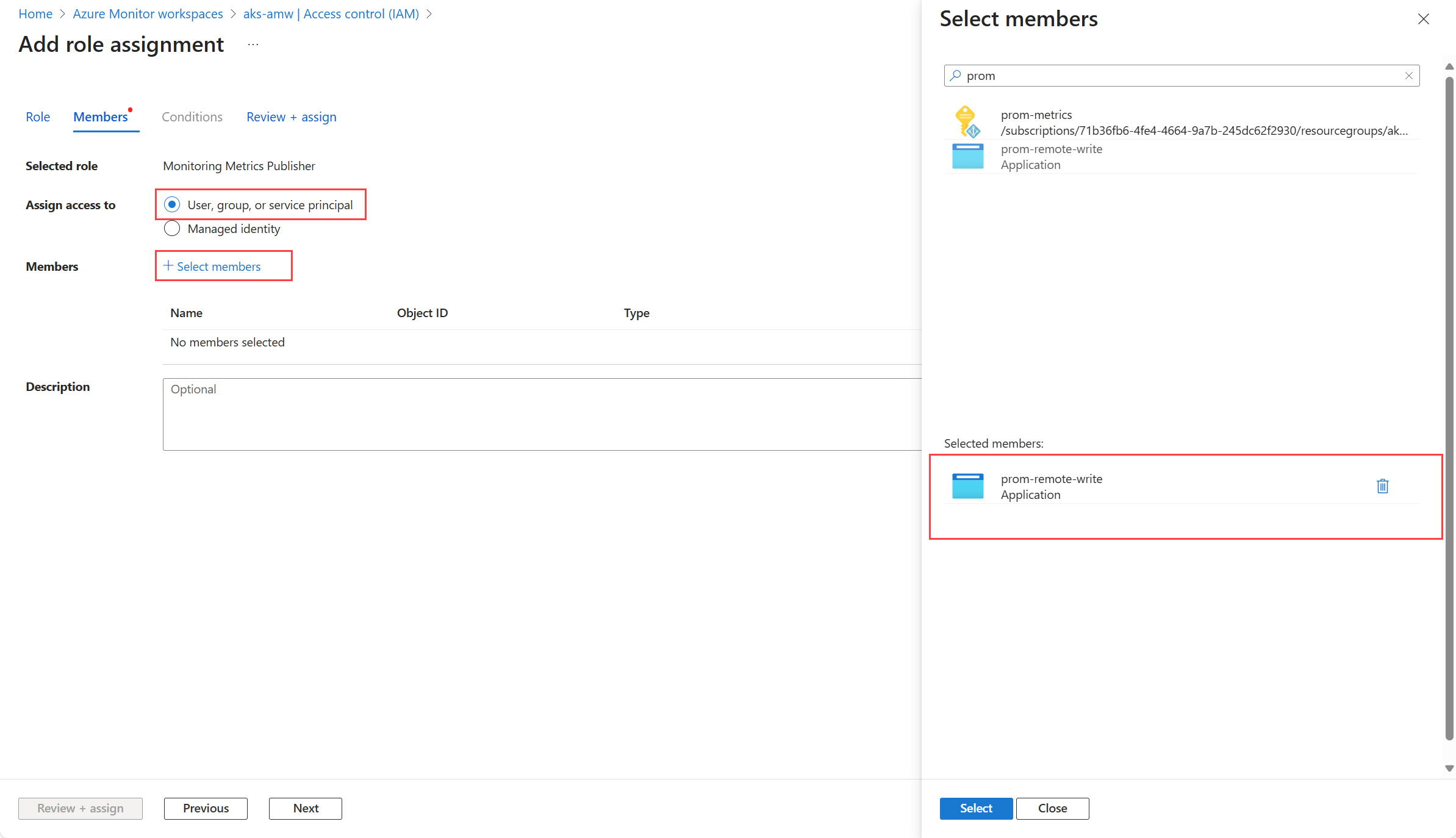 创建要使用的标识后,需要向其授予对与 Azure Monitor 工作区关联的数据收集规则(DCR)的访问权限,该规则将接收远程写入数据。 创建工作区时会自动创建此 DCR。 将在群集或 VM 的远程写入配置中指定此标识。