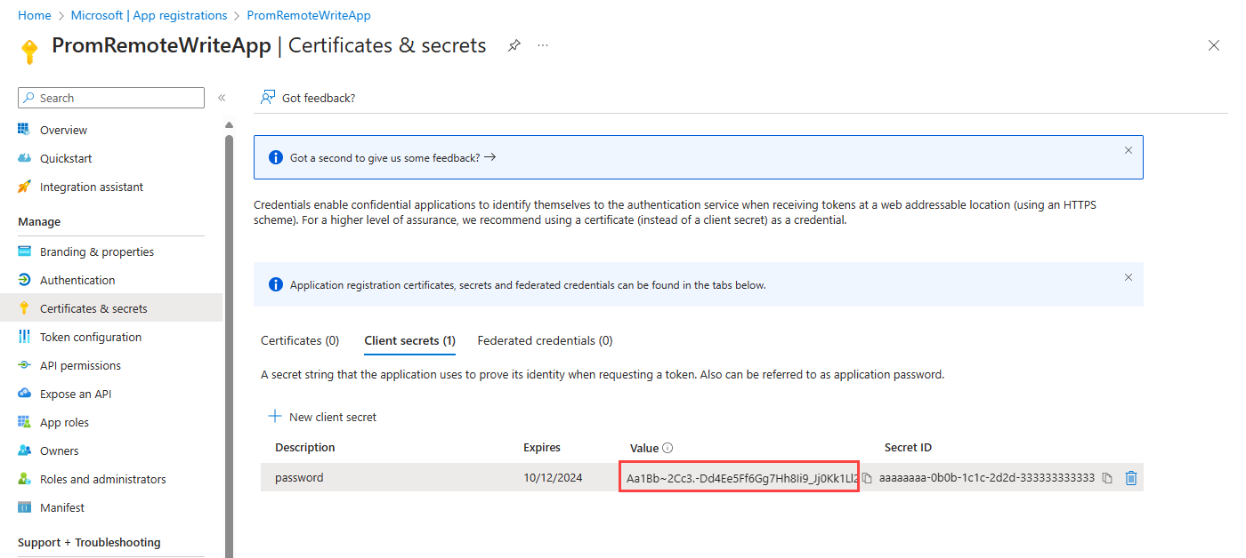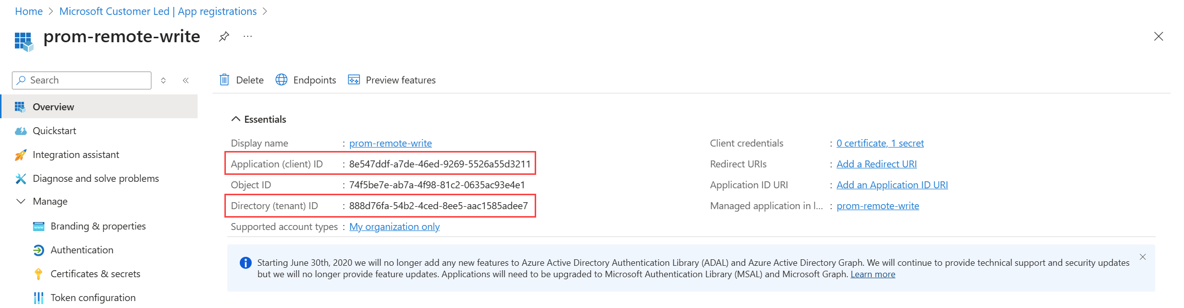 • Microsoft Entra 应用程序身份验证需要 Prometheus 版本 2.48 或更高版本。