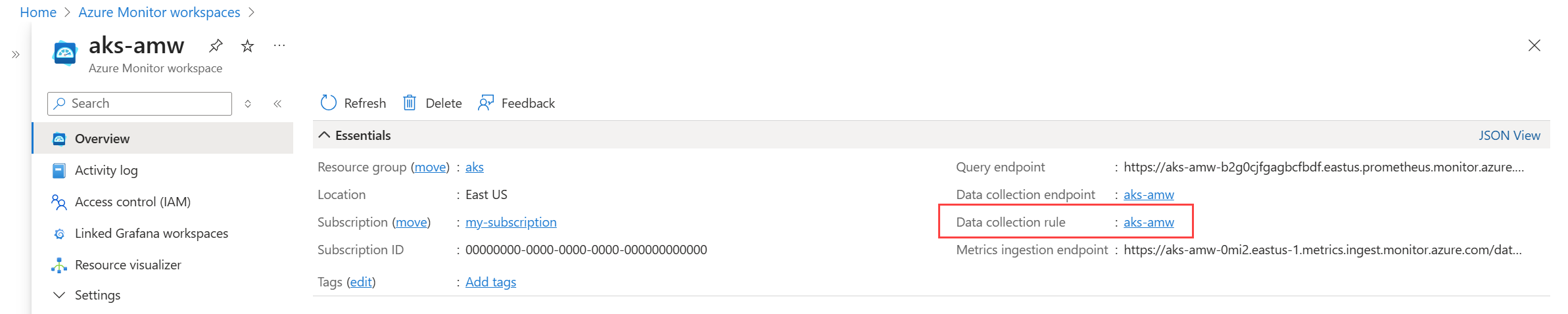 显示 Azure Monitor 工作区的 DCR 链接的屏幕截图。