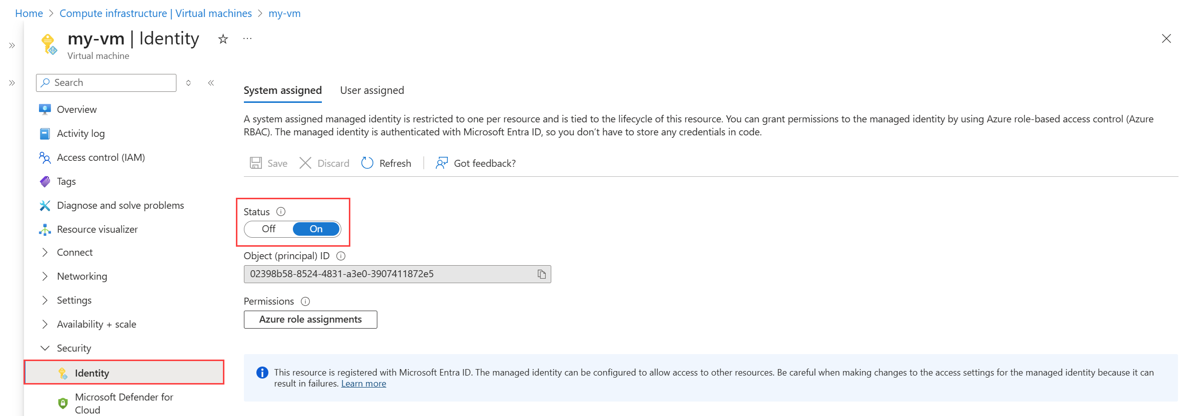 你不会直接创建系统分配的托管标识,而是为 Azure 虚拟机或虚拟机规模集启用它。 对于 Azure VM,可以在创建 VM 时启用标识,或者在以后从 Azure 门户中的 “标识 ”页启用该标识。 对于 VMSS,必须在创建后启用它。 有关启用系统托管标识的不同选项,请参阅 在 Azure 虚拟机(VM)上配置托管标识, 以及 为虚拟机规模集上的 Azure 资源配置托管标识