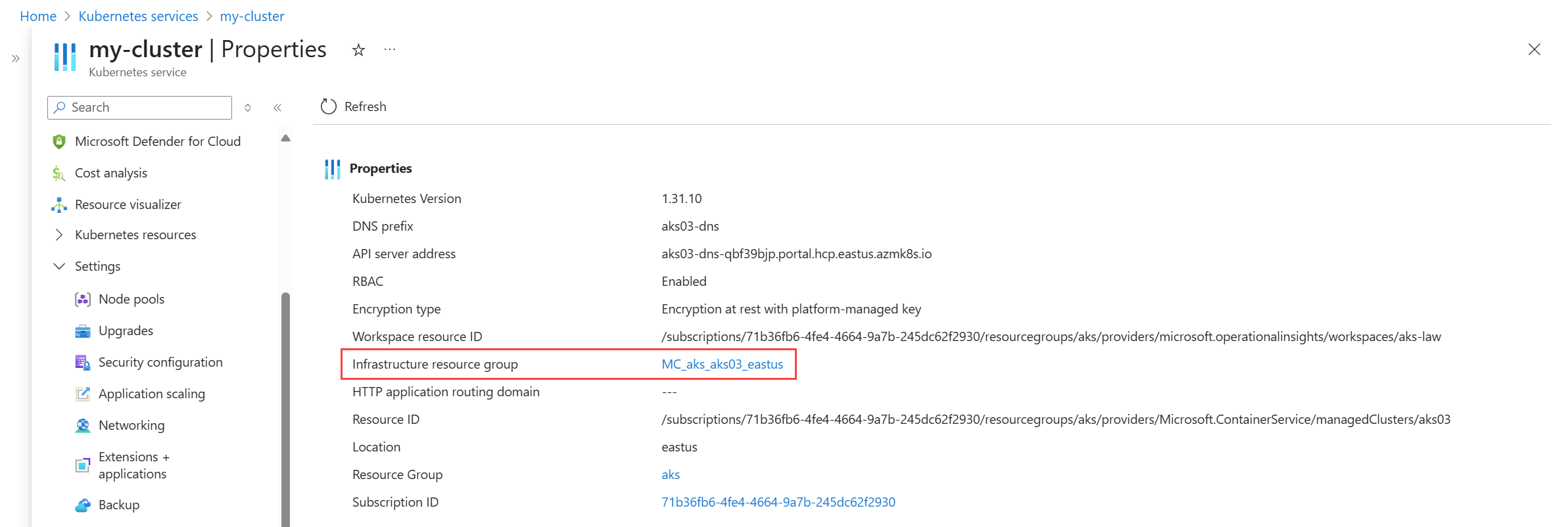 显示 AKS 群集的基础结构资源组的屏幕截图。