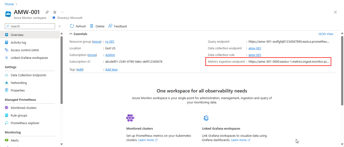 远程写入是在 Prometheus 配置文件 prometheus.yml 或 Prometheus 运算符中配置的。 最后一步是向自管理 Prometheus 服务器的 配置文件 添加远程写入。 除了创建的标识的详细信息,还需要获取 Azure Monitor 工作区的指标数据导入端点(URL)。 从 Azure 门户中 Azure Monitor 工作区的 “概述 ”页获取此值,并记下此值。