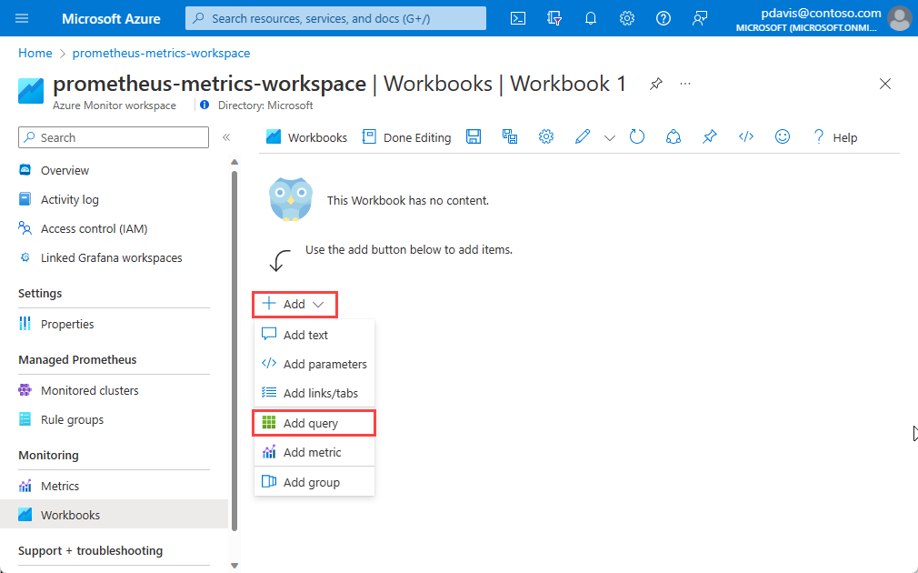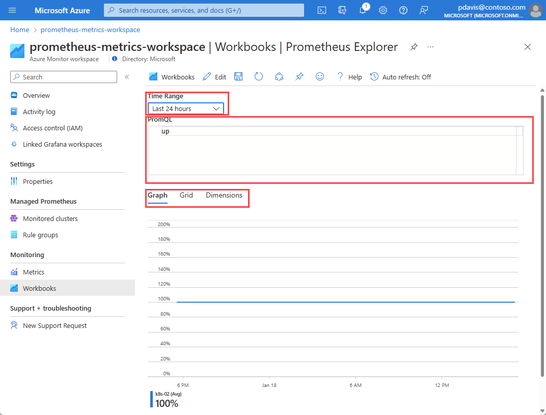 Azure Monitor 工作区包括一个浏览工作簿,用于查询 Prometheus 指标。