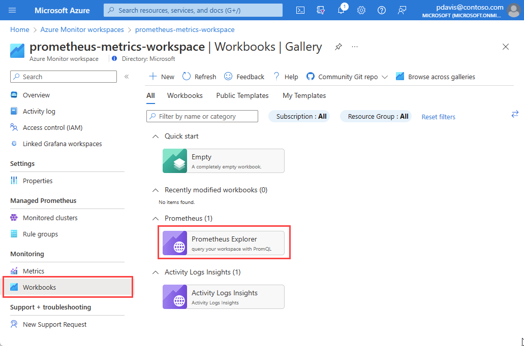 在 “工作簿” 菜单项和 Azure Monitor 工作区库中,选择 “Prometheus 资源管理器 ”工作簿磁贴。
