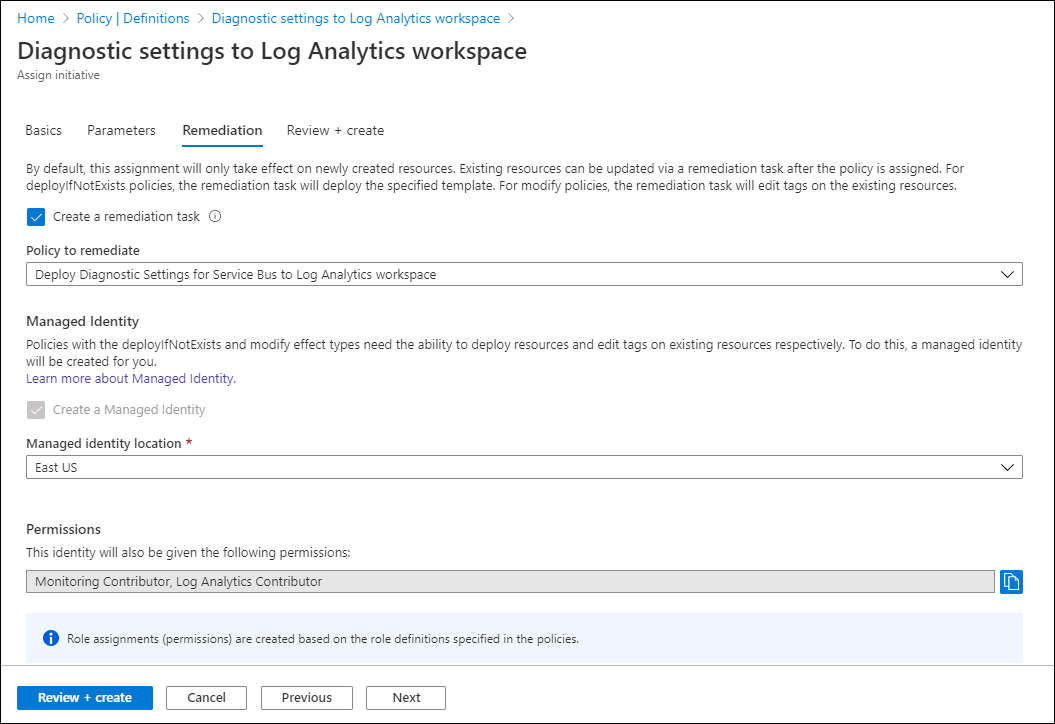 该计划在创建时应用于每个虚拟机。 修正任务将该计划中的策略定义部署到现有资源,因此,你可以为已创建的任何资源创建诊断设置。