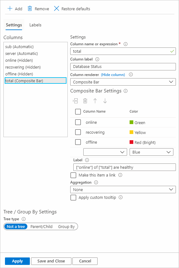 在下面的示例中,所有“联机”、“脱机”和“正在恢复”列均将最大聚合设置为自身,并且总计列的聚合为“继承”。