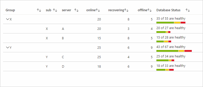 下图显示数据库状态的组合条。 它显示处于联机、脱机和正在恢复状态的服务器数量。