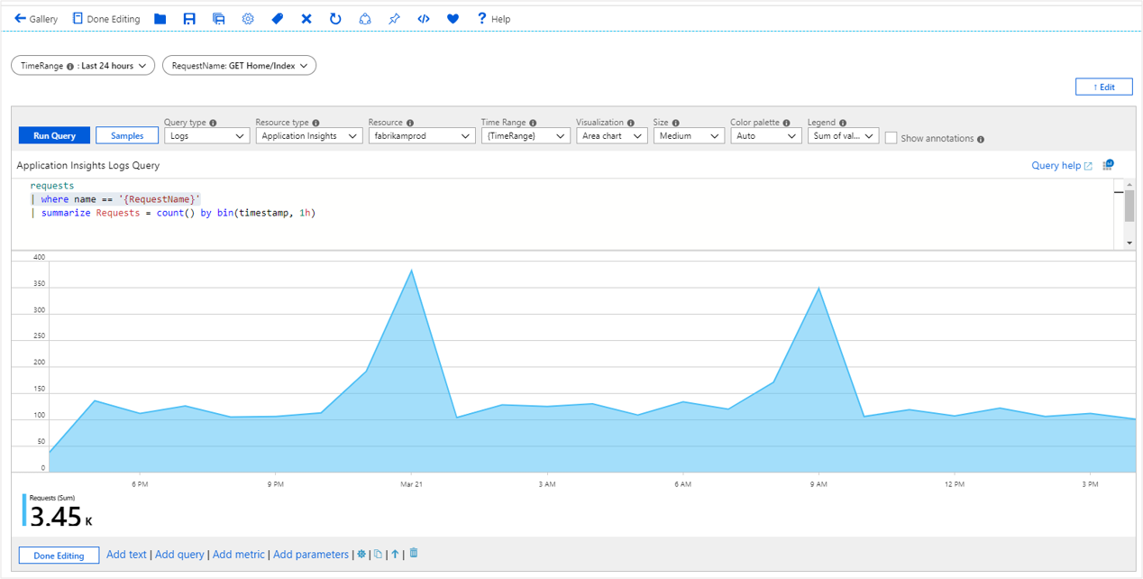 requests | where name == '{RequestName}' | summarize Requests = count() by bin(timestamp, 1h)此片段可根据查询评估时间扩展为: