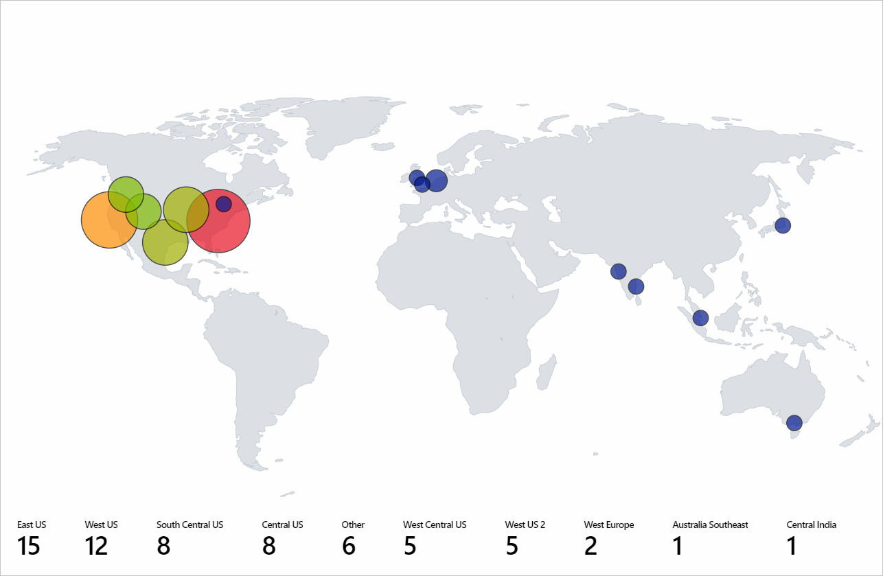 Azure 工作簿地图可视化效果有助于精确定位特定区域中的问题,并显示监视数据的高级聚合视图。 地图聚合了映射到每个位置或国家/区域的所有数据。