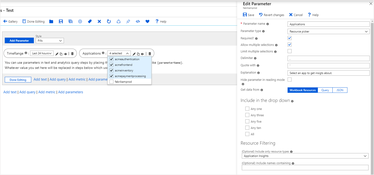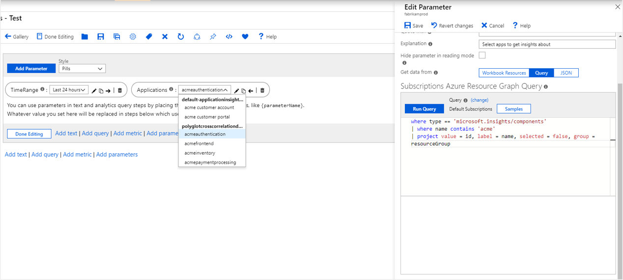 where type == 'microsoft.insights/components' | project value = id, label = id, selected = false, group = resourceGroup选择“保存”以创建参数。