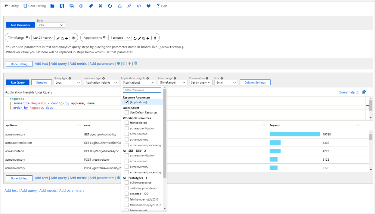 requests | summarize Requests = count() by appName, name | order by Requests desc运行查询以查看结果。