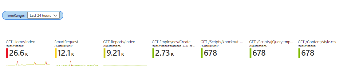 let topRequests = requests | summarize Requests = count() by appName, name | top 7 by Requests desc; let topRequestNames = topRequests | project name; requests | where name in (topRequestNames) | make-series Trend = count() default = 0 on timestamp from {TimeRange:start} to {TimeRange:end} step {TimeRange:grain} by name | join (topRequests) on name | project-away name1, timestamp选择“运行查询”。 在运行查询之前将