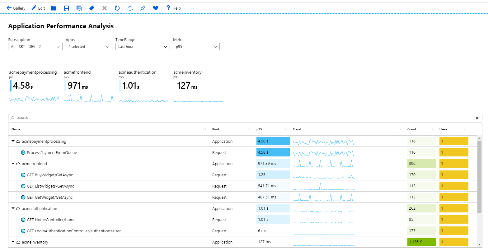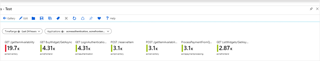 requests | summarize Requests = count() by appName, name | top 7 by Requests desc将“大小”设置为“完整”。