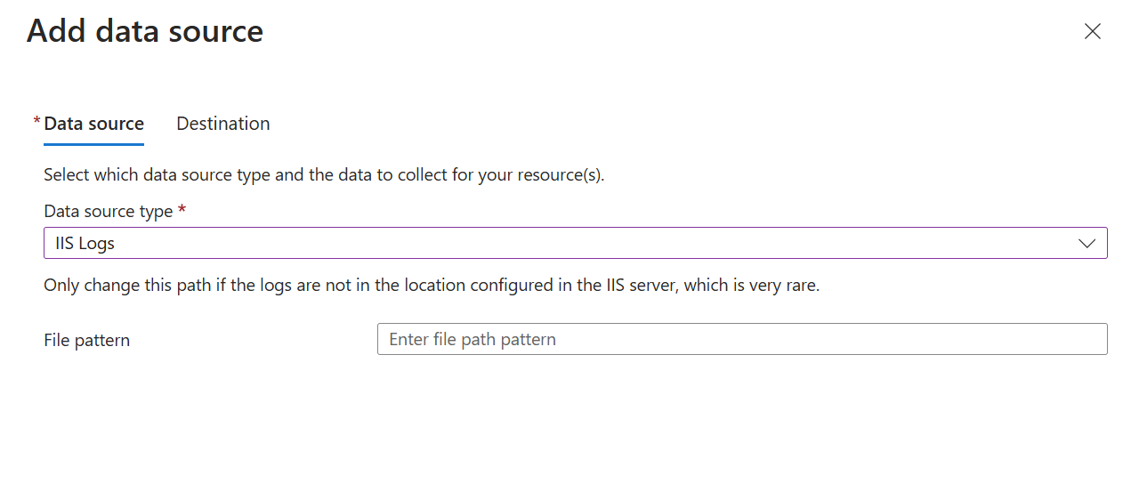 通过使用 Azure Monitor 从虚拟机客户端收集数据中的流程创建 DCR。 在 DCR 的“收集和传递”选项卡上,从“数据源类型”下拉列表中选择 IIS 日志。 如果日志文件存储在与 IIS 中配置的位置不同的位置,则只需指定文件模式来标识日志文件所在的目录。 在大多数情况下,可以将此值留空。