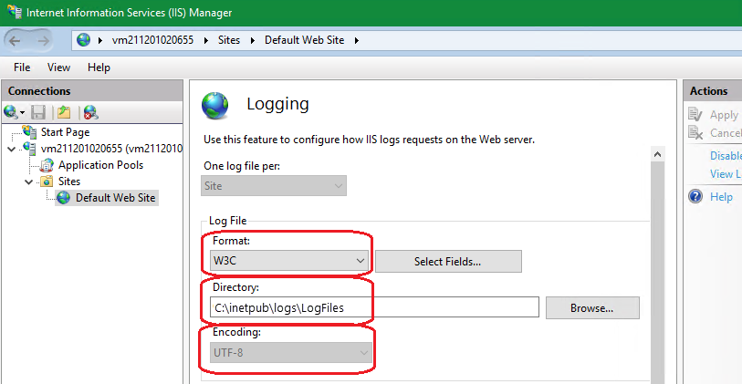 • 验证 IIS 日志是否已配置为 W3C 格式。