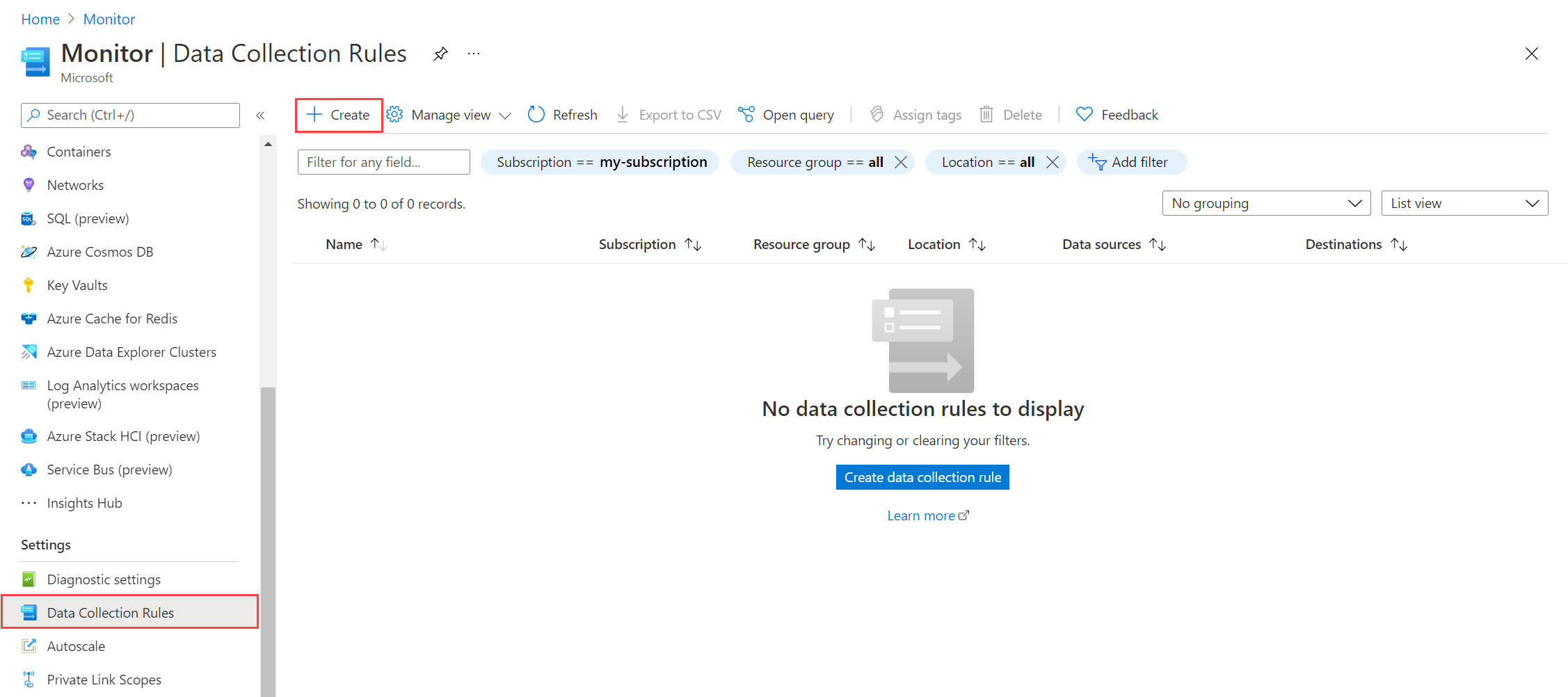在 Azure 门户的“监视”菜单中,选择“数据收集规则”。 然后,选择“创建”以新建 DCR。