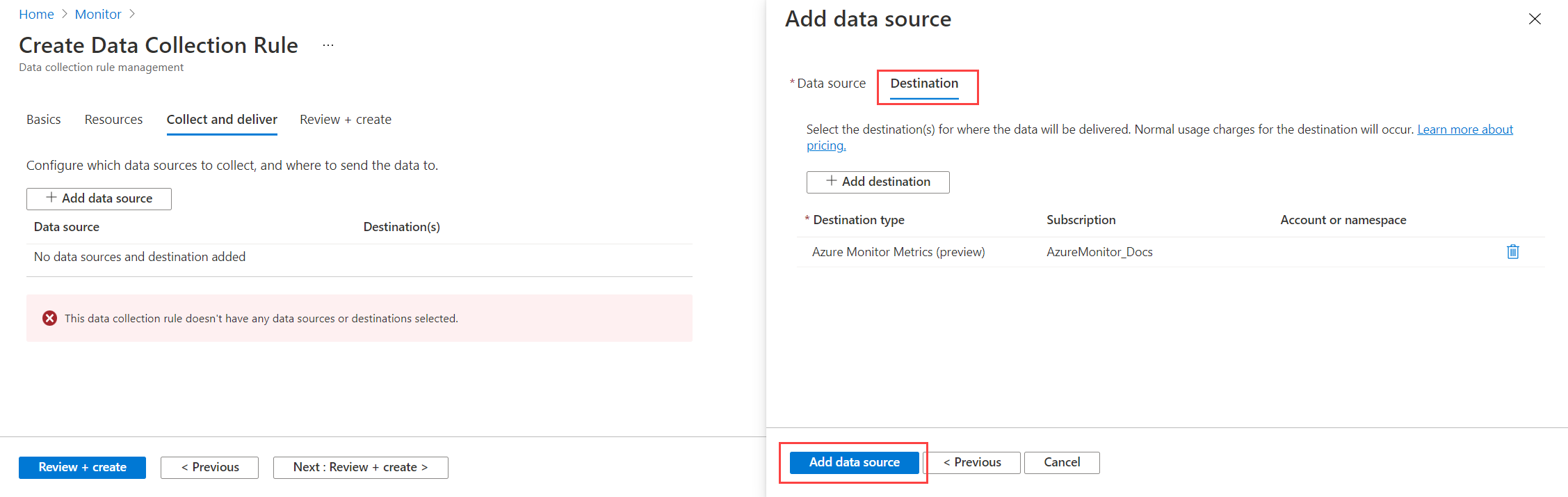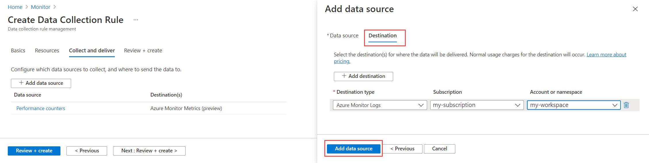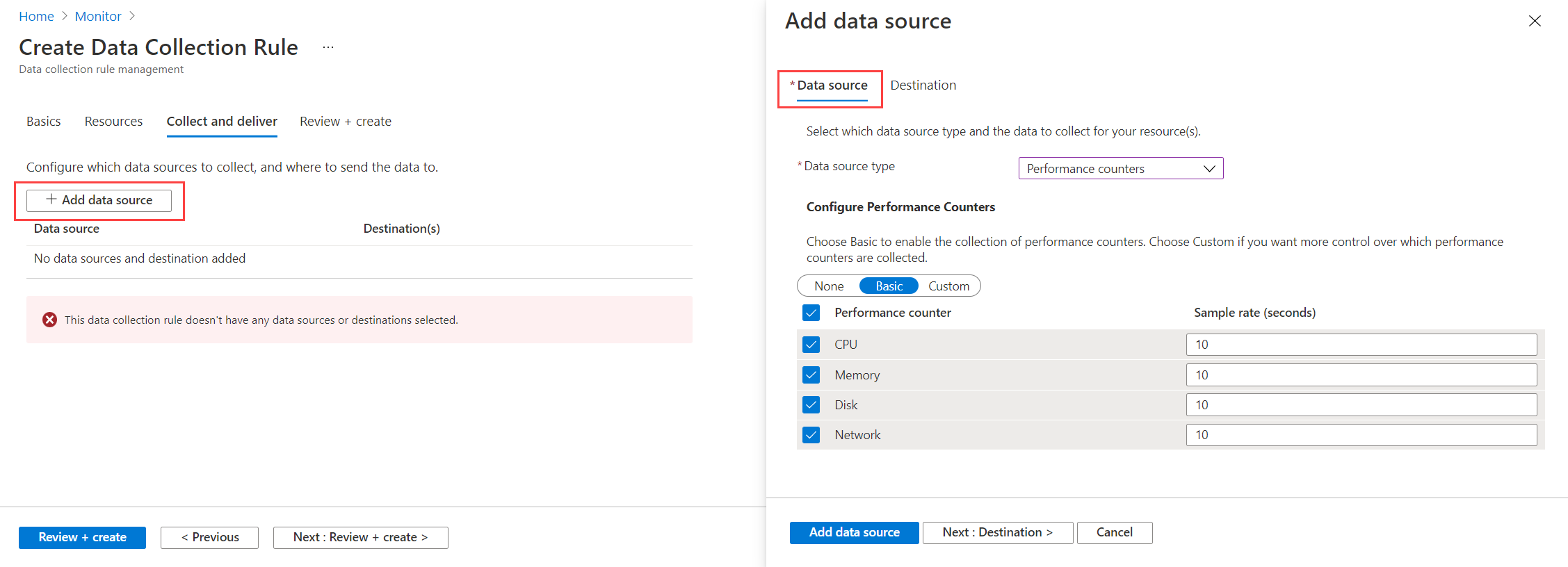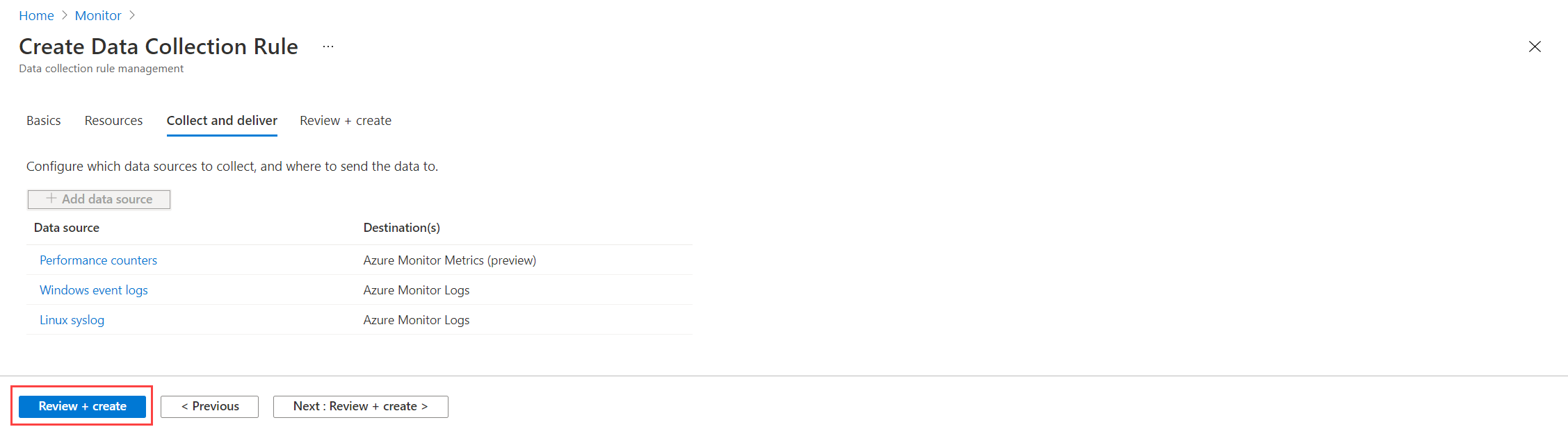 单个 DCR 可以有多个数据源。 对于本教程,我们使用同一规则以收集来宾指标和来宾日志。 我们会向 Azure Monitor 指标和 Azure Monitor 日志发送指标,以便可以使用指标资源管理器和 Log Analytics 对其进行分析。