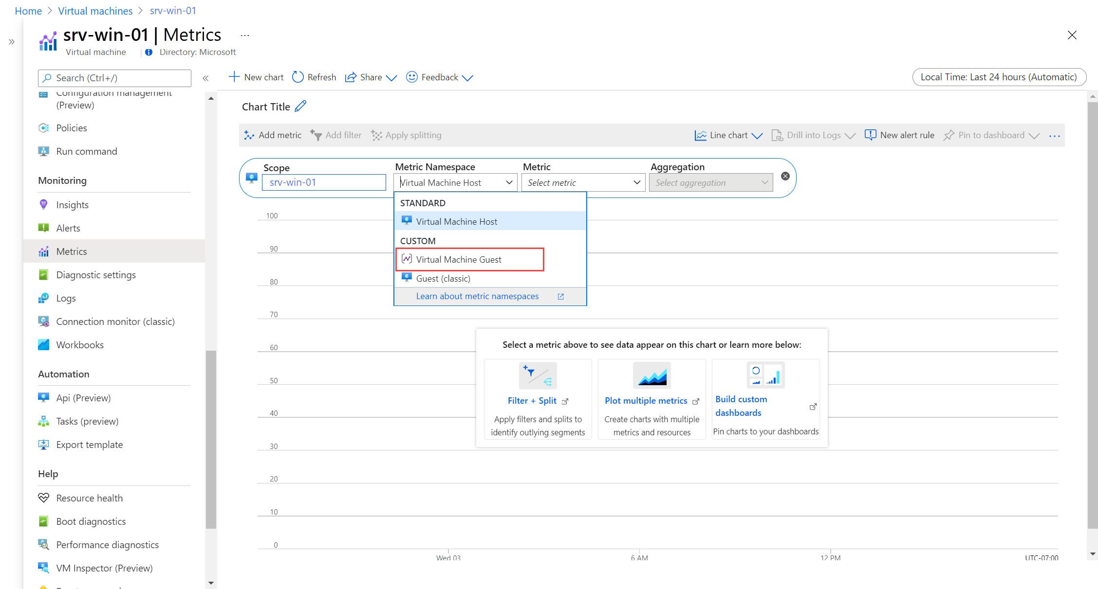 可以 任何其他 Azure 资源 一样,在没有 DCR 的情况下,使用指标资源管理器查看主机虚拟机的指标。 借助 DCR,可以使用指标资源管理器查看来宾指标和主机指标。