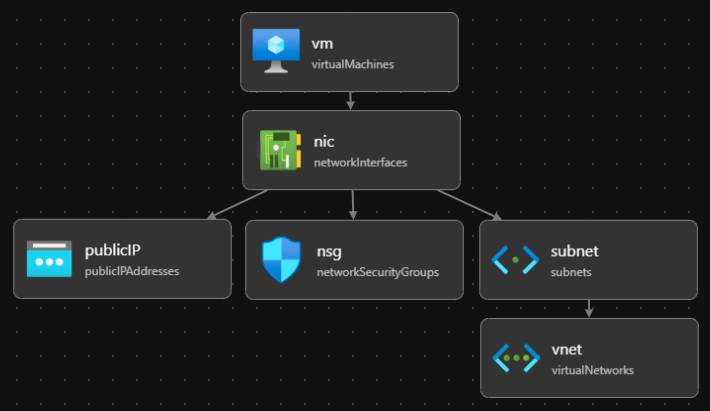 Bicep 可视化工具显示 Bicep 文件中定义的资源及其之间的依赖关系。 下图是 Linux 虚拟机的 Bicep 文件的可视表示形式。