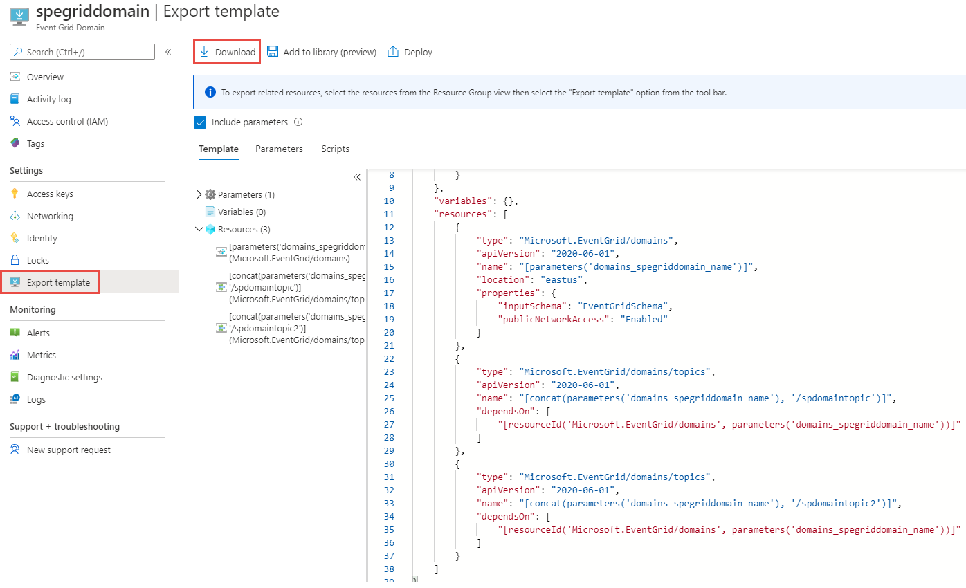 location更新为目标区域或位置。 若要获取位置代码,请参阅 Azure 位置。 区域的代码是没有空格的区域名称。"type": "Microsoft.EventGrid/domains", "apiVersion": "2020-06-01", "name": "[parameters('domains_spegriddomain_name')]", "location": "chinanorth3",保存模板。