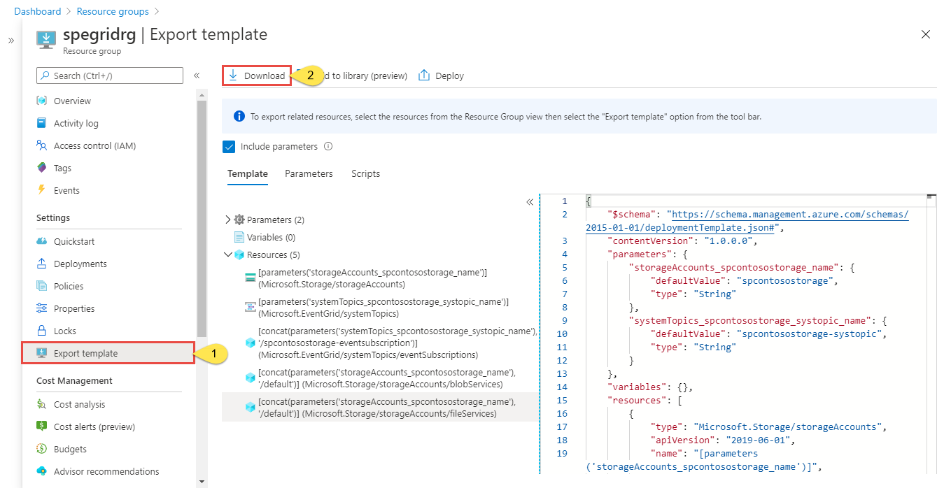 若要开始,请为包含系统事件源(Azure 存储帐户)及其关联的系统主题的资源组导出资源管理器模板。