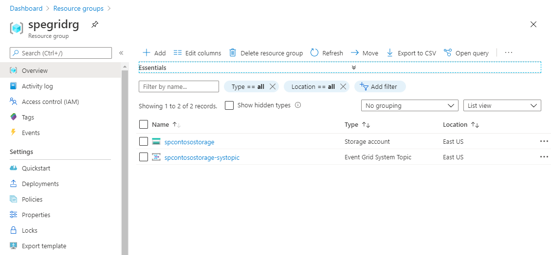 - 在“资源组”页面上,验证是否已创建事件源(在本例中为 Azure 存储帐户)和系统主题。