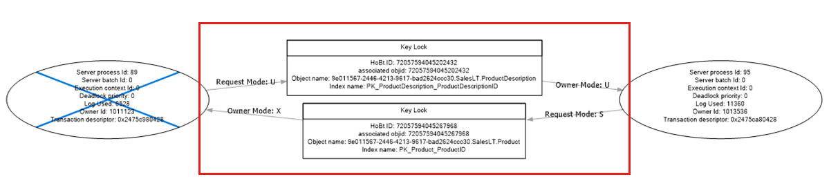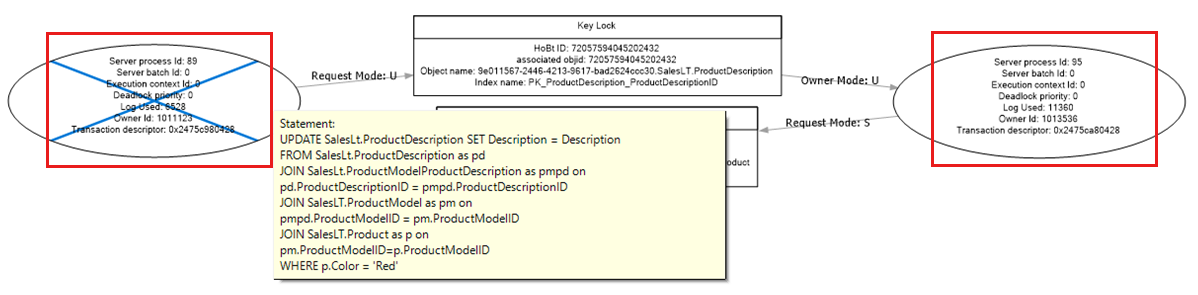 此外,死锁图中涉及的某些语句可能不包含在死锁图中。 在我们的示例中,会话 A 在单个事务中运行了两条 update 语句。 死锁图中仅包括第二条 update 语句(导致死锁的 update 语句)。