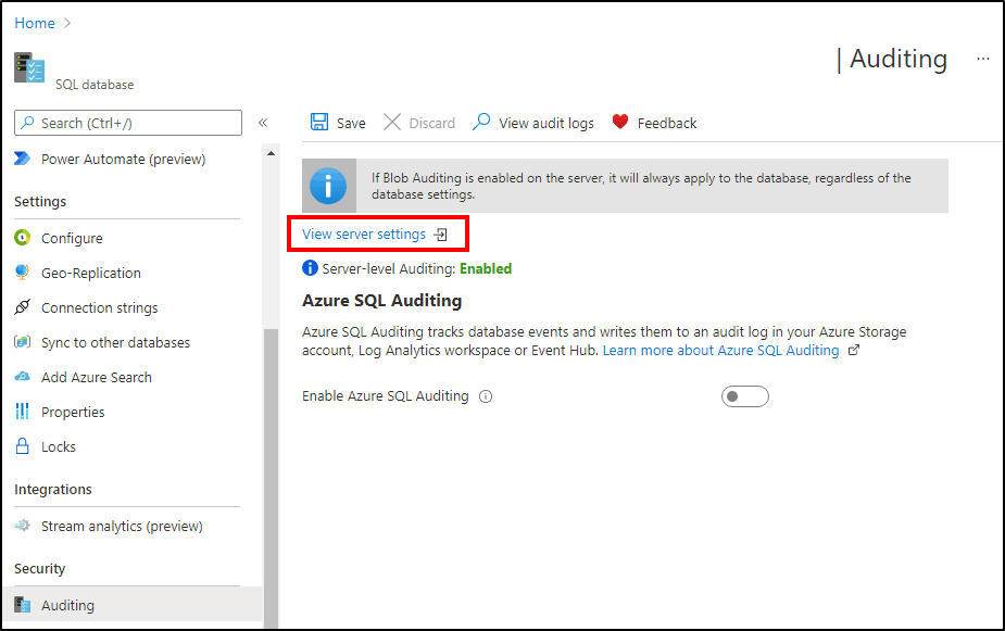导航到“SQL 数据库”或“SQL Server”窗格中“安全性”标题下的“审核”。
