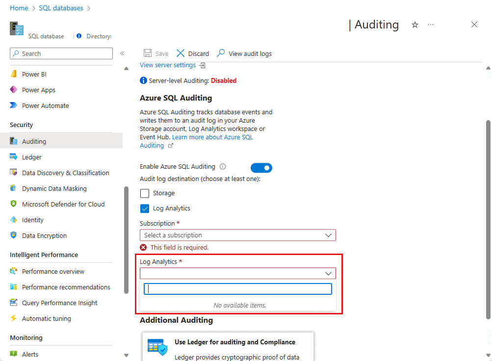 如果希望在数据库级别启用审核,请将“审核”切换到“启用”。 如果启用了服务器审核,数据库配置的审核将与服务器审核并存。