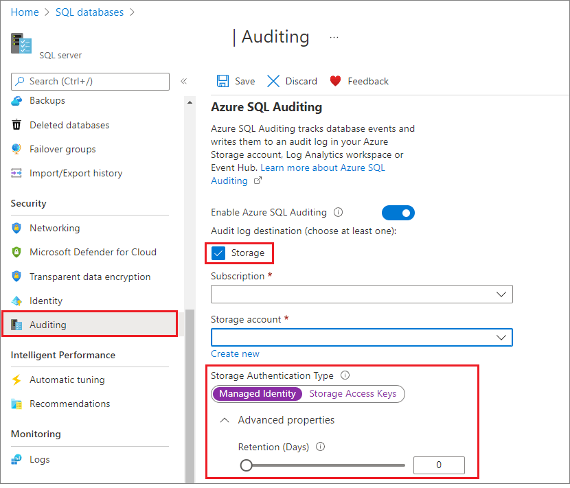 若要配置将审核日志写入存储帐户,请在转到“审核”部分时选择“存储” 。 选择要在其中保存日志的 Azure 存储帐户。 可以使用以下两种存储身份验证类型:托管标识和存储访问密钥。 对于托管标识,支持系统分配的托管标识和用户分配的托管标识。 默认情况下会选择分配给服务器的主要用户标识。 如果没有用户标识,则会创建系统分配的托管标识并将其用于身份验证。 选择身份验证类型后,若要选择保留期,请打开“高级属性”并选择“保存”。 早于保留期的日志会被删除。