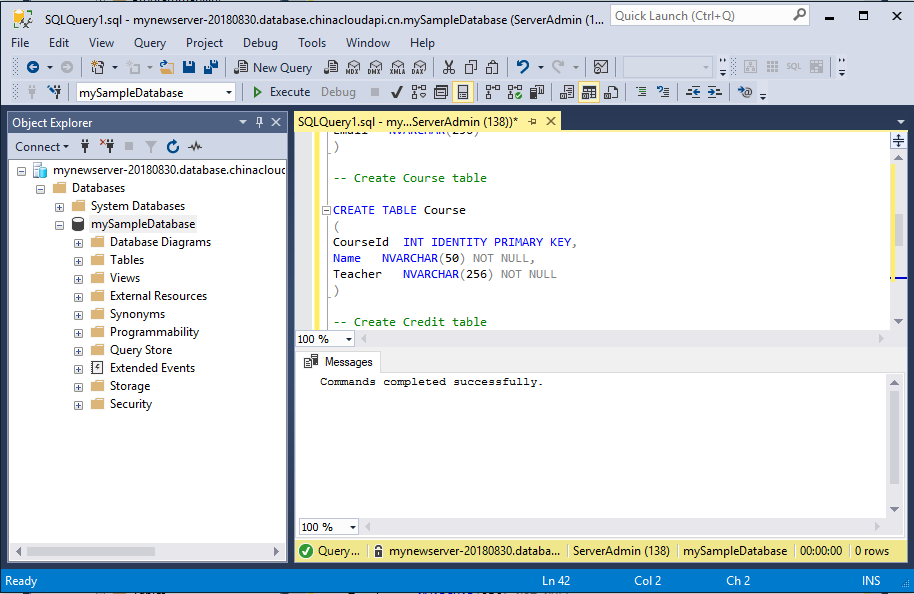在 Object Explorer 中,右键单击 yourDatabase并选择 New Query。 此时会打开一个空白查询窗口,该窗口连接到数据库。