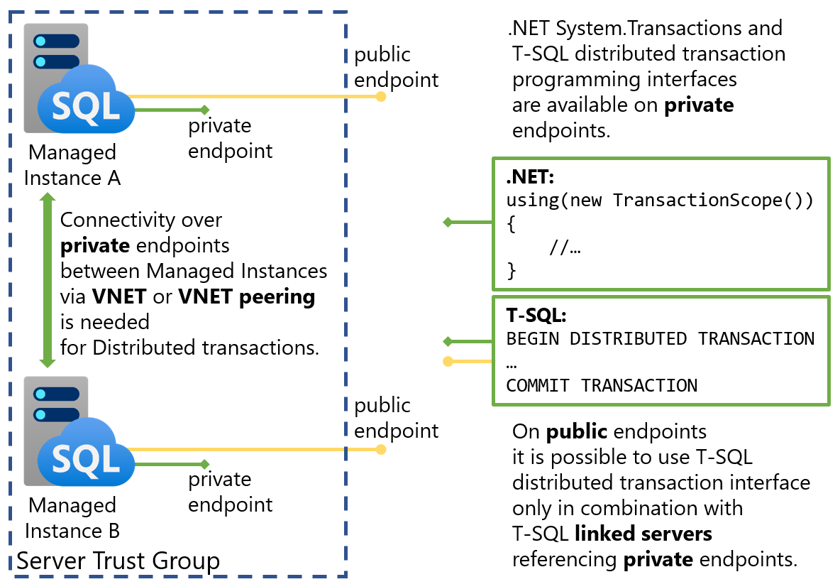 使用 Transact-SQL 的服务器端分布式事务仅适用于 Azure SQL 托管实例。 分布式事务只能在属于同一 服务器信任组的实例之间执行。 在这种情况下,托管实例需要使用链接服务器来相互引用。