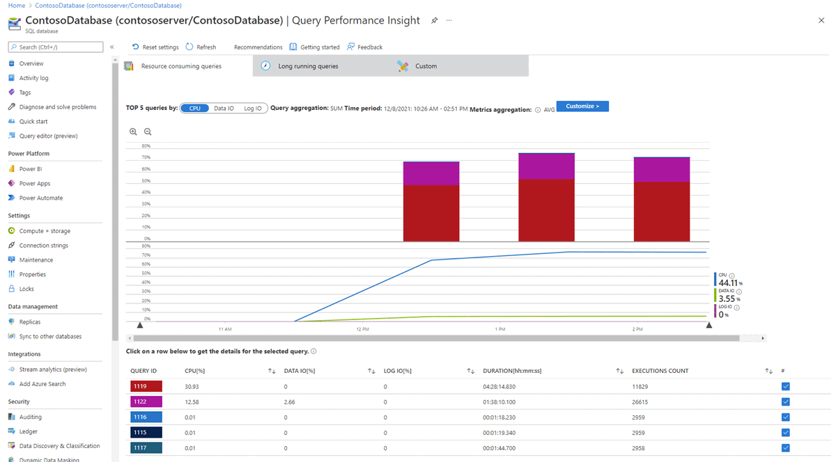 该期间运行的排名靠前的五个查询会显示在 CPU 使用率图上方的垂直条中。 在图表上选择一段时间,或使用“自定义”菜单浏览特定时间段。 此外,还可以增加显示的查询数。