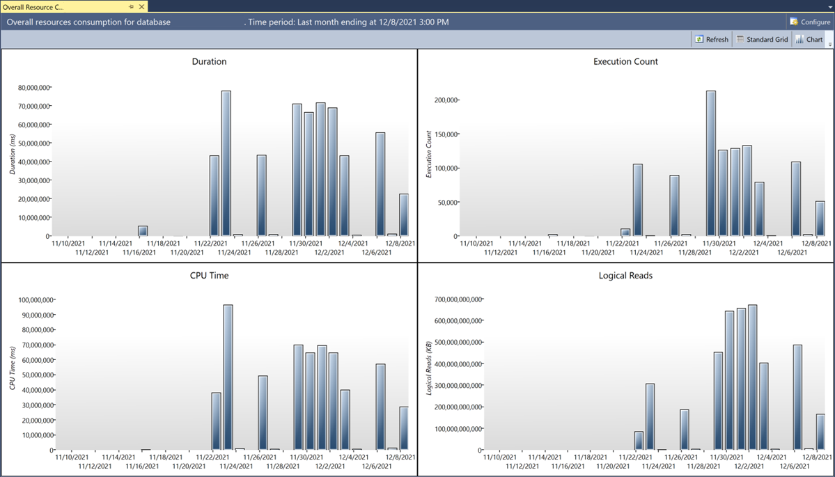- 工作负载中是否出现使用大量 CPU 的新查询,或者是否看到定期运行查询的频率提高? 使用以下任何方法进行调查。 查找历史记录有限的查询(新查询),并查看历史记录较长的查询的执行频率。