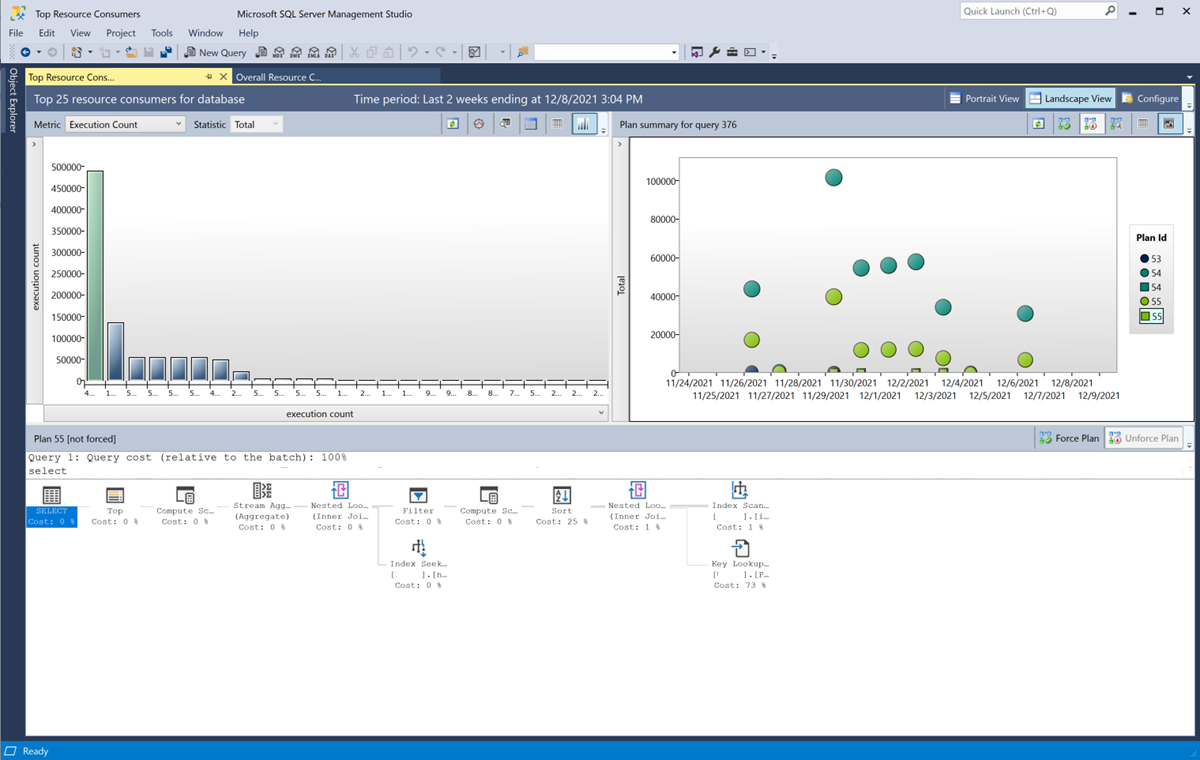按照以下步骤在 SSMS 的交互式查询存储工具中使用查询 ID 检查查询在一段时间内的执行计划。