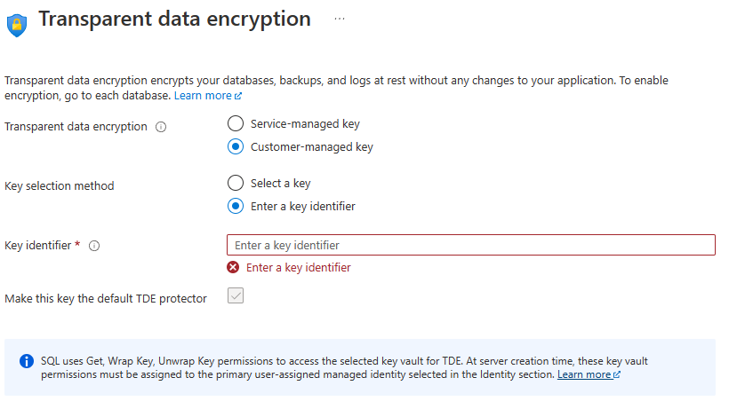 有关配置数据库级别密钥的信息,请参阅 具有数据库级客户管理的密钥的 TDE 的标识和密钥管理。