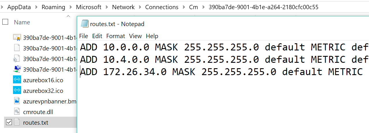 %AppData%\Roaming\Microsoft\Network\Connections\Cm\<GUID>\routes.txt中。如此图所示,有两个条目用于所涉及的每个虚拟网络,还有第三个条目与门户中配置的 VPN 终结点相对应。