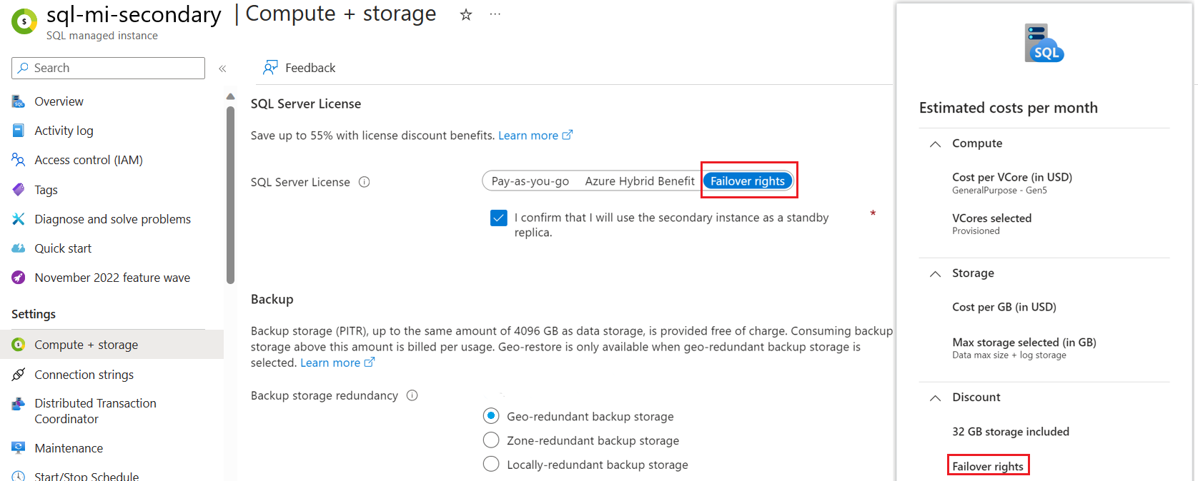 In Compute + storage for your secondary SQL managed instance, confirm that the Failover rights license is activated. Under Cost summary, view the failover discount you're currently receiving for that instance.