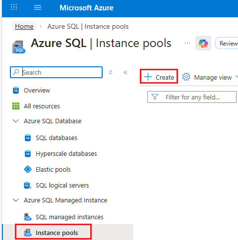 在 “实例池 ”窗格中,选择“ + 创建 ”以打开 “创建 Azure SQL 托管实例池 ”页。